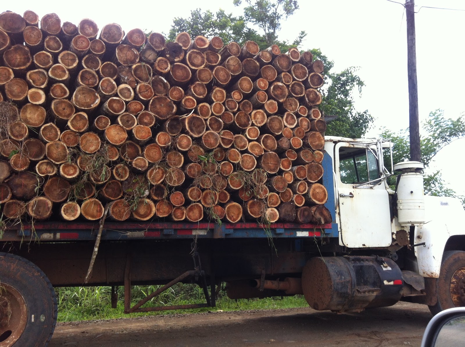 A log truck delivering wood from the farm. Most jobs are manual labor in our town. |